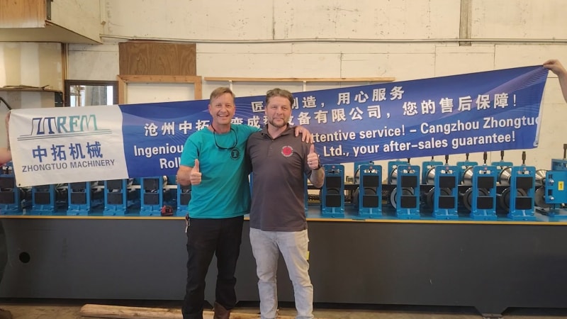 近日,由滄州中拓冷彎成型設(shè)備有限公司研發(fā)制造的彩鋼瓦滴水檐設(shè)備在美國佛羅里達(dá)州成功完成安裝與調(diào)試工作。