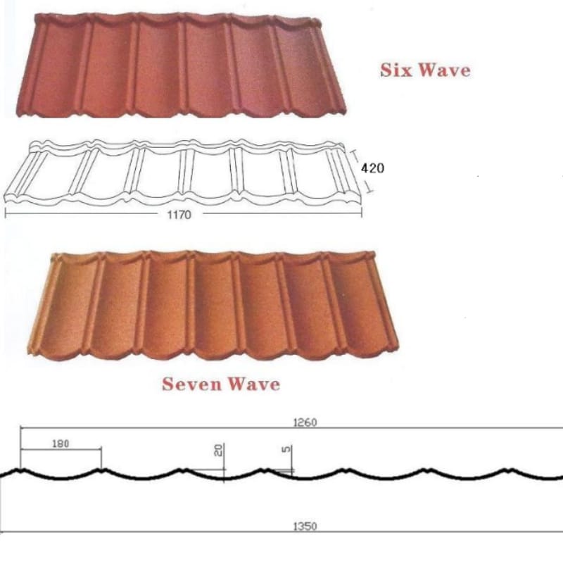 彩石金屬瓦采用防腐性能優(yōu)異的鋁鋅鋼板為基材,水性丙烯酸酯為粘結(jié)劑,燒結(jié)彩砂為面層,耐候丙烯酸樹脂為外層(相當(dāng)于油漆)的新型屋面材料。